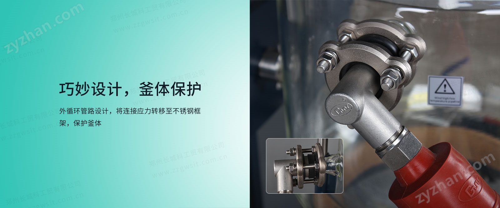 ● 夾套進、出液口連接不銹鋼保溫軟管,消除進出液口應力。