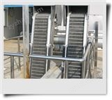 耙齒鏈運轉到的上部時,由于槽輪和彎軌的導向,使每組耙齒之間產生相對自清運動,絕大部分固體物質靠重力落下。另一部分則依靠清掃器的反向運動把粘在耙齒上的雜物清掃干凈。