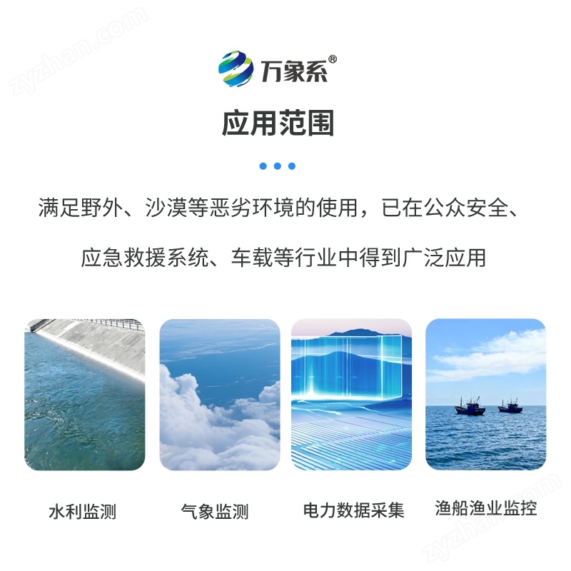 該終端主要應用于水利監測、氣象監測、電力數據采集、漁船漁業監控、車載等行業;為滿足野外、沙漠等惡劣環境的使用,北斗終端采用IP67防護等級要求設計。目前已經在公安、特種車輛、水利監測、應急救援系統中得到廣泛應用。