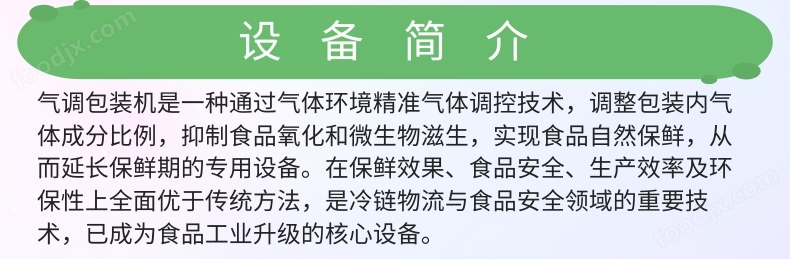 氣調(diào)包裝機(jī)通過抽真空后充入按比例混合的保鮮氣體(通常為氮?dú)?/span>N?、二氧化碳CO?、氧氣O?中的兩種或三種),置換包裝內(nèi)空氣。其中: