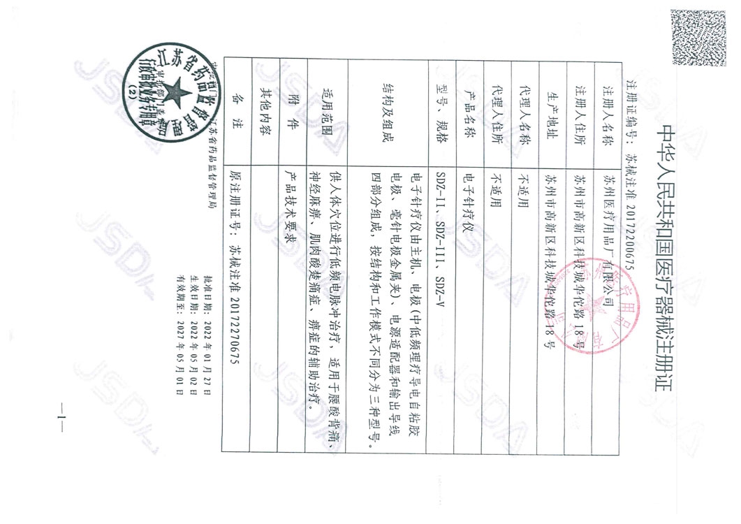 適用范圍/預期用途 產品在醫療機構中使用,供人體穴位進行低頻電脈沖治療,適用于腰酸背痛、神經麻痹、肌肉酸楚痛癥、痹癥的輔助治療。