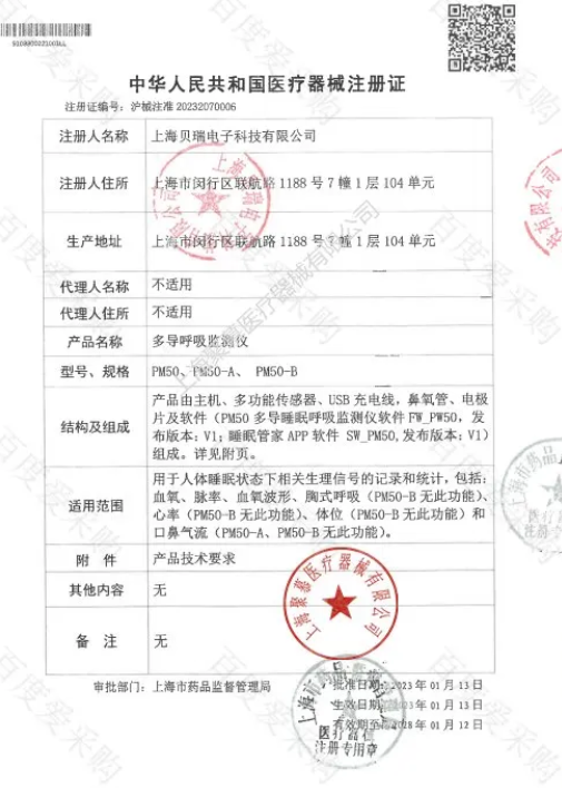用于人體睡眠狀態下相關生理信號的記錄和統計,包括:血氧、脈率、血氧波形、胸式呼吸(PM50-B無此功能)、心率(PM50-B無此功能)、體位(PM50-B無此功能)和口鼻氣流(PM50-A、PM50-B無此功能)。