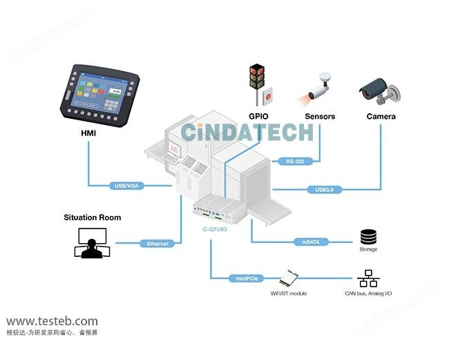 四方信達C-Q7U03嵌入式工控機還可以根據用戶需求輕松集成各種擴展模塊、附加內存/存儲設備、數字和模擬量 I/O 以及無線通信功能。將USB 端口與 AI 模塊卡相連接,能夠高效快速的完成生產安全檢測,且不會占用太多 CPU 資源。除此之外,兩個 RS-232/485 端口可以連接 IR 傳感器或打印機,而 WIFI 模塊則可用于采集和傳輸數據。以上解決方案可助力客戶以成本快速重建自有生產線。
