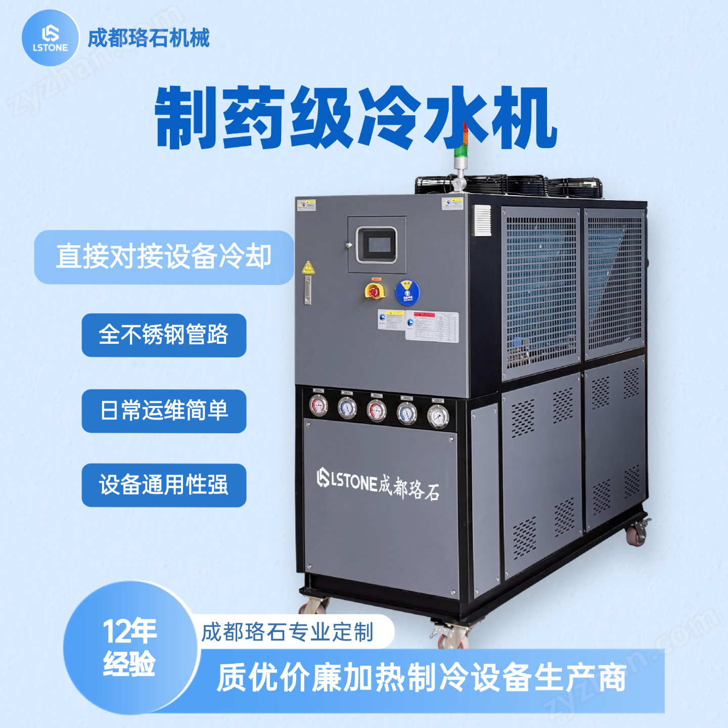 目前成都珞石機械的冷水機類型有:-60℃低溫型冷水機、5℃至35℃常溫型冷水機、風冷式冷水機、水冷式冷水機、一體式帶加熱的冷水機、高低溫一體機等多種機型可選。已經廣泛服務于川渝醫藥化工、新能源、復合材料、測試、科研院校等多個行業。