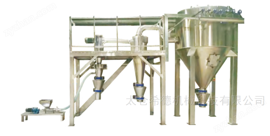 分級(jí)收集:內(nèi)置渦輪分級(jí)器(轉(zhuǎn)速 3000–15000 r/min)精準(zhǔn)篩分,合格細(xì)粉(通常 D97=2–75 μm)經(jīng)旋風(fēng)分離器 + 脈沖除塵器收集,粗顆粒返回粉碎區(qū)循環(huán)加工。
