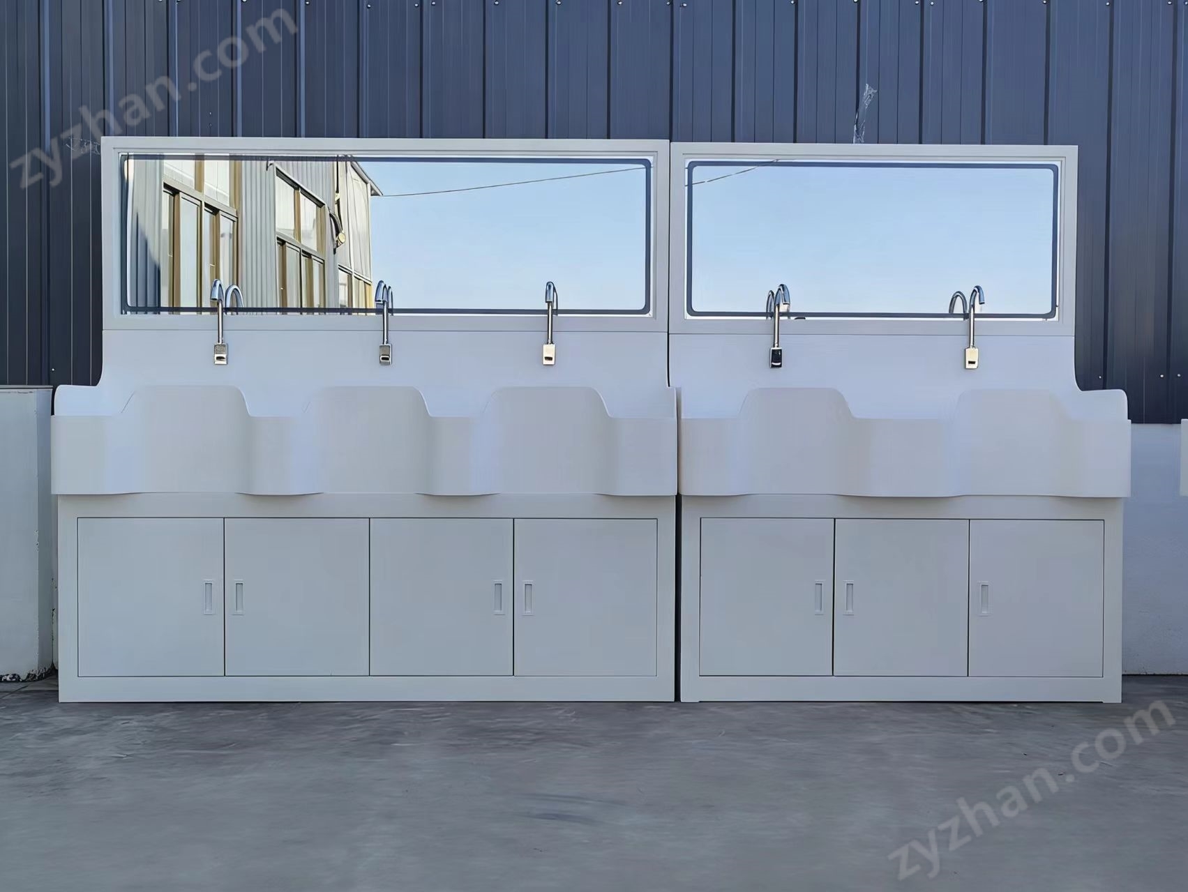出水方式有:感應式、膝控式、腳踏式和手動開關,一臺洗手池可客戶要求選擇單一出水方式或多種出水方式。洗手池分高背和低背,高背總高度1800mm,配有美容鏡,照明燈,皂液器,可按客戶要求配置烘手器和熱水器。低背板無配置。 柜體采用彩金鋼化玻璃門美觀大方,堅固耐用,顏色可以可選。設備配有304不銹鋼鵝頸水龍頭,造型美觀大方,紅外線感應出水靈敏,抗干擾性強。漏電保護設計,保證了操作人的使用安全,保證了操作人員的安全使用,