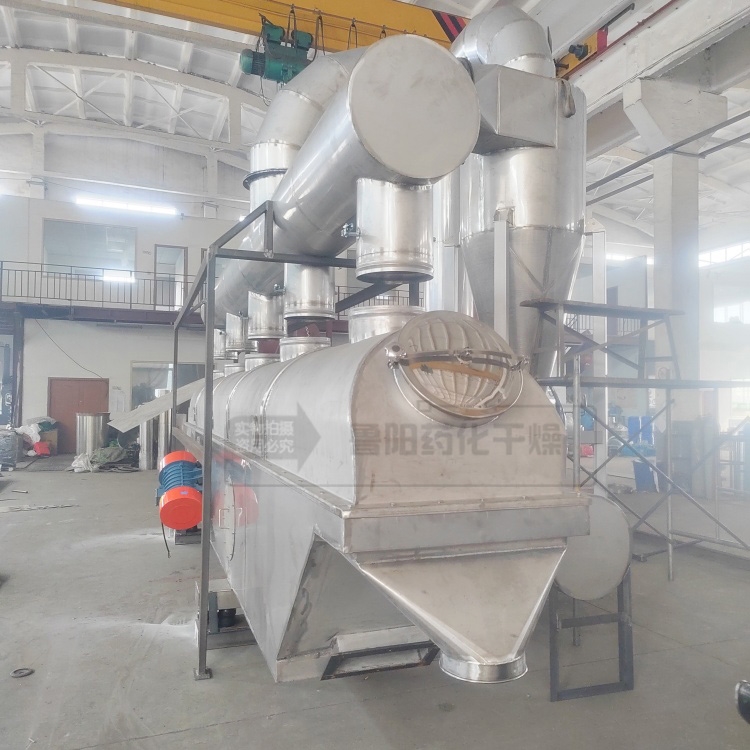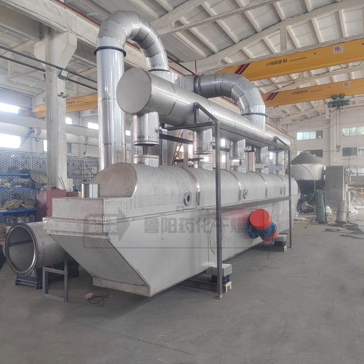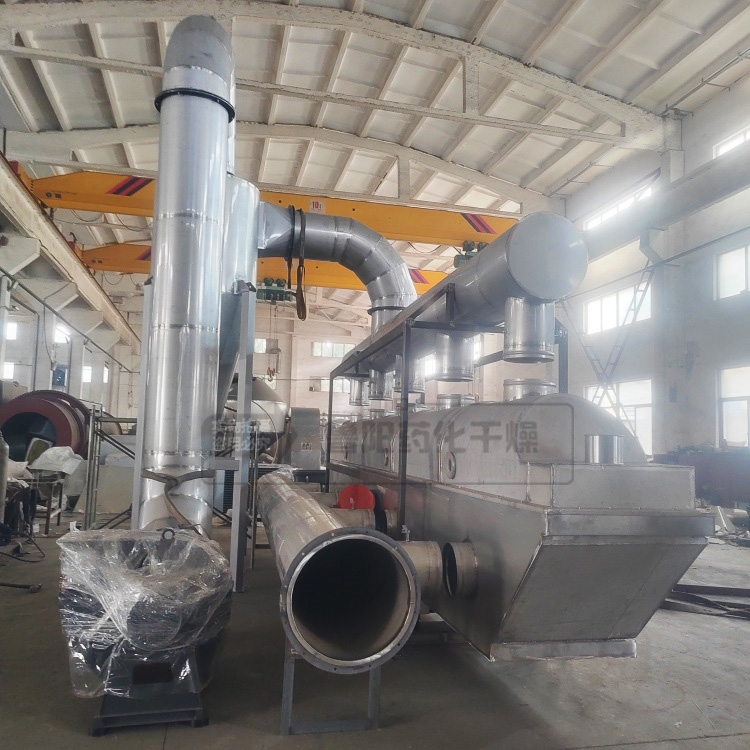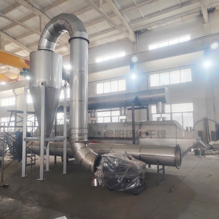 物料自進料口進入機內,在激振力作用下,物料沿水平方向拋擲向前連續運動,熱風穿過流化床孔板向上穿過同物料換熱后,