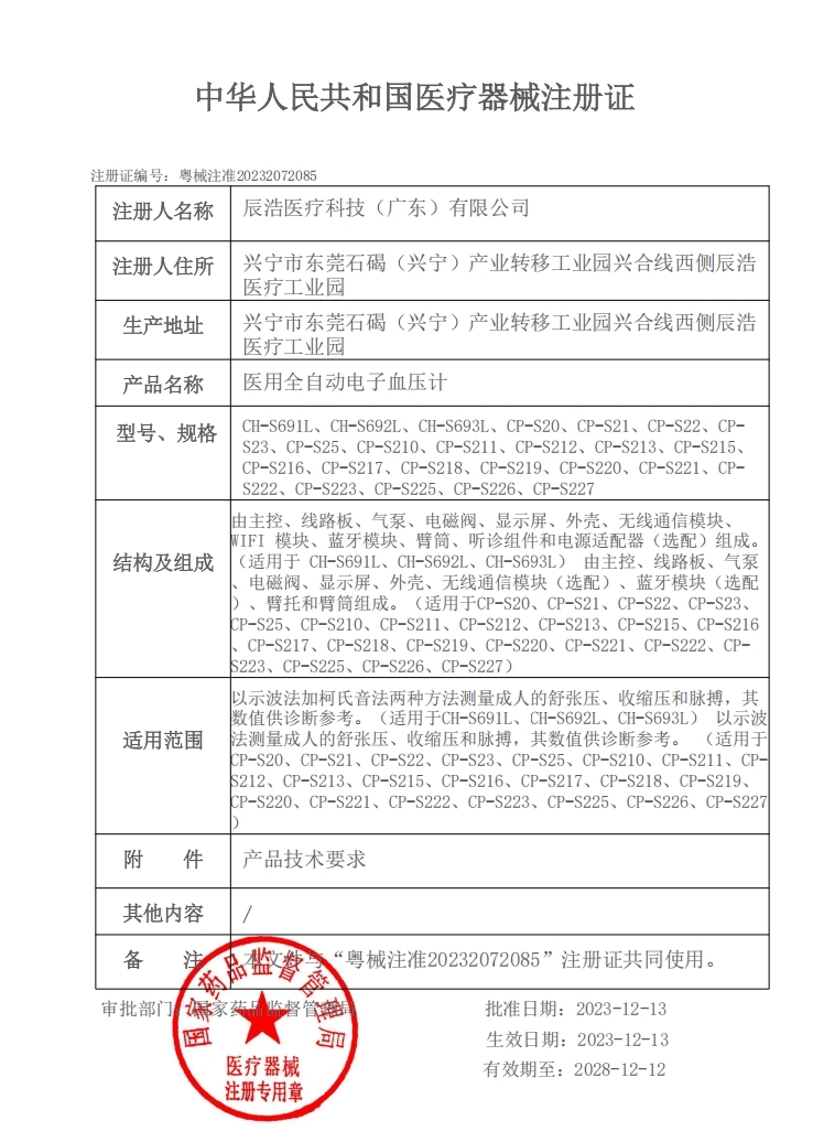 結構及組成/主要組成成分 由主控、線路板、氣泵、電磁閥、顯示屏、外殼、無線通信模塊、WIFI 模塊、藍牙模塊、臂筒、聽診組件和電源適配器(選配)組成。(適用于 CH-S691L、CH-S692L、CH-S693L) 由主控、線路板、氣泵、電磁閥、顯示屏、外殼、無線通信模塊(選配)、藍牙模塊(選配)、臂托和臂筒組成。(適用于CP-S20、CP-S21、CP-S22、CP-S23、CP-S25、CP-S210、CP-S211、CP-S212、CP-S213、CP-S215、CP-S216、CP-S217、CP-S218、CP-S219、CP-S220、CP-S221、CP-S222、CP-S223、CP-S225、CP-S226、CP-S227)