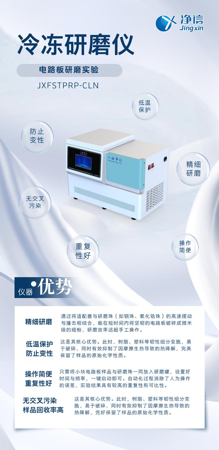 凈信冷凍研磨儀憑借其低溫、避免污染的研磨特性,成功解決了電路板這類(lèi)復(fù)雜復(fù)合材料的前處理難題。它不僅是提升RoHS檢測(cè)、材料成分分析等數(shù)據(jù)準(zhǔn)確性的“得力助手”,也是在電子廢棄物資源回收領(lǐng)域進(jìn)行物料分析的“神兵利器”。選擇凈信冷凍研磨儀,意味著選擇了一條通往更可靠實(shí)驗(yàn)結(jié)果的捷徑,為您的科研與質(zhì)控工作提供了強(qiáng)有力的技術(shù)保障。